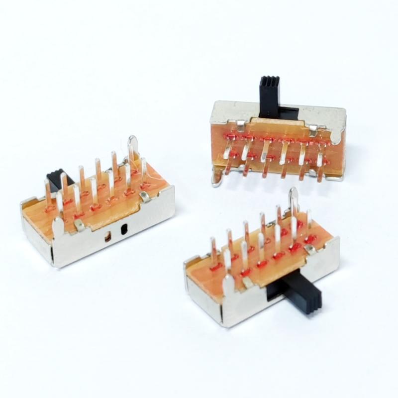 L'interruttore a scorrimento 4P2T controlla simultaneamente quattro circuiti indipendenti con due stati di commutazione stabili, consentendo una selezione efficiente dei circuiti multi-percorso in applicazioni compatte.